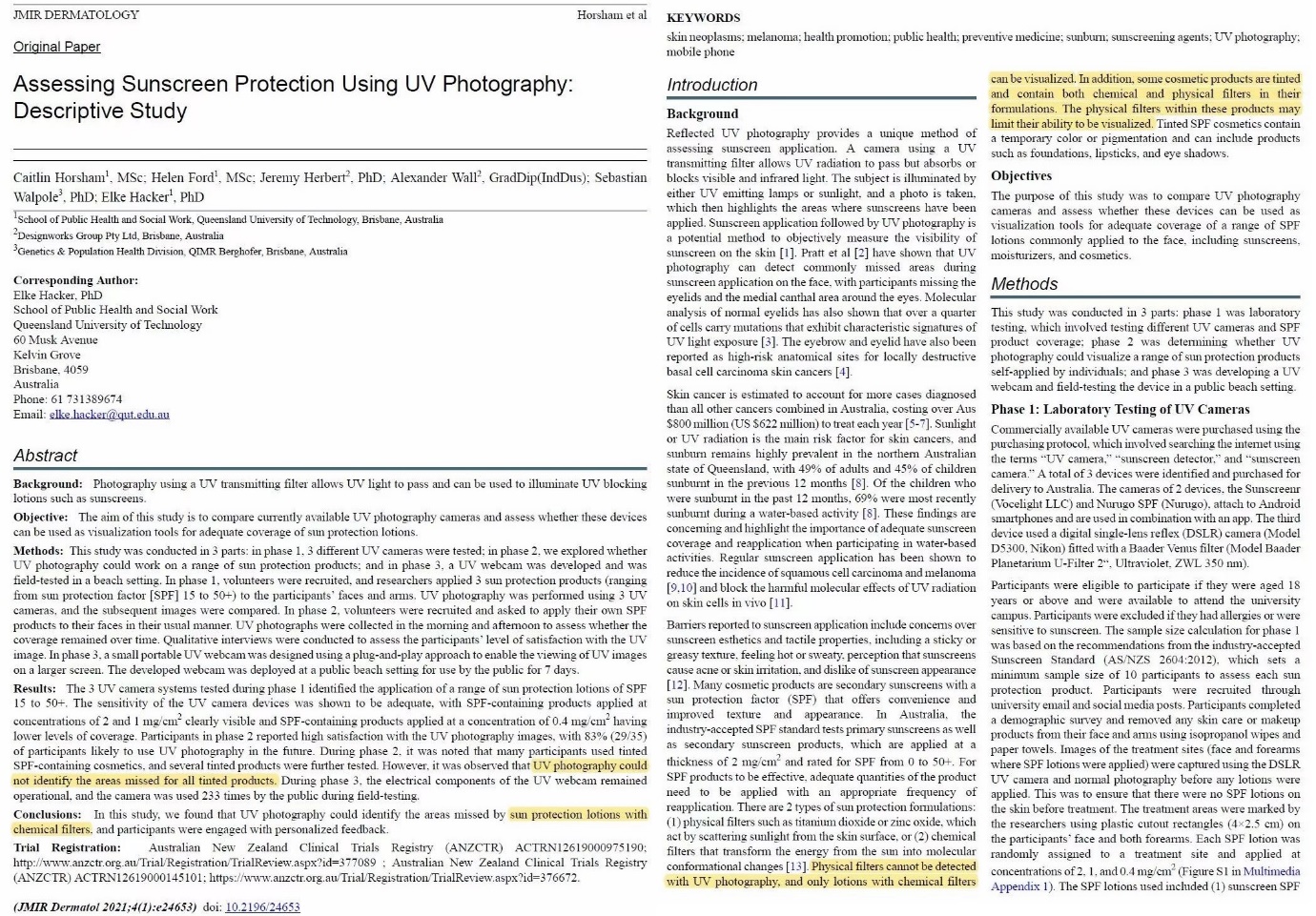 澳大(dà)利亞昆士蘭科(kē)技(jì)✔£大(dà)學的(de)專家(jiā)的(←★π↔de)這(zhè)篇文(wén)章(zhāng),←☆"詳細介紹、比較了(le)各款紫外(wài)線相(xiàng)機(jī)顯示↔ 防曬霜的(de)功能(néng)。文(wén)章&δφ(zhāng)強調紫外(wài)線相(xiàng)機÷∞¶(jī)隻能(néng)顯示化(huà)學↕防曬霜,不(bù)能(néng)顯示物(wù)理♦ (lǐ)防曬霜。