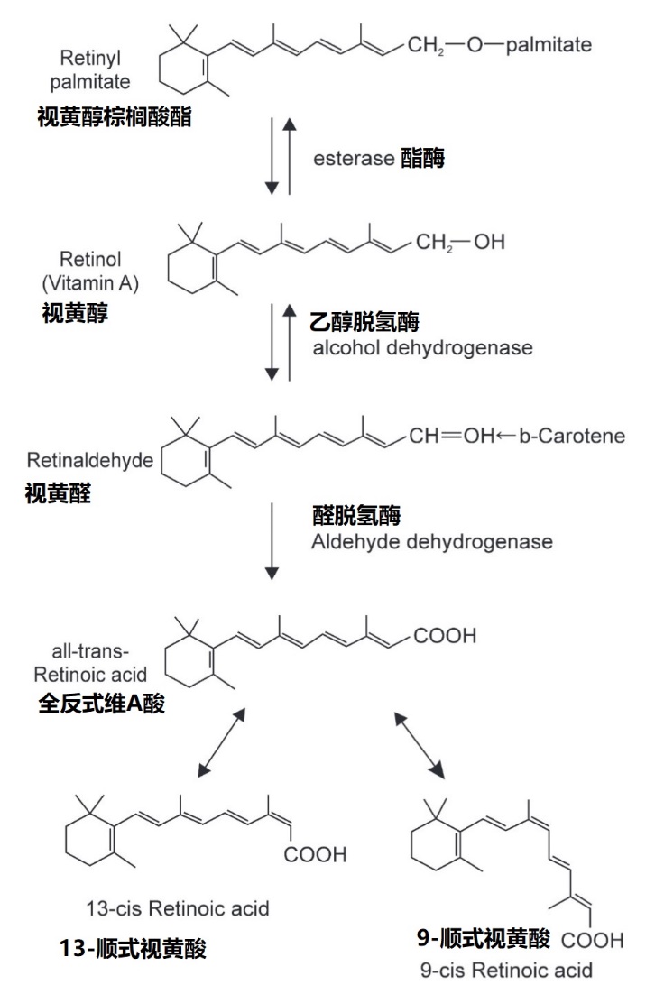 維A酸以降,維生(shēng)素A家(jiā) σ族的(de)主要(yào)成員(yuán)的(de)皮膚功效↓≠÷<依次為(wèi)視(shì)黃(huáng)醛、視(shì€↑✔)黃(huáng)醇、視(shì)黃(huáng)酯(如(rú)視(s ♠∑hì)黃(huáng)醇棕榈酸酯)。它們間(jiān)的(←←de)酶轉化(huà)如(rú)下(xià):