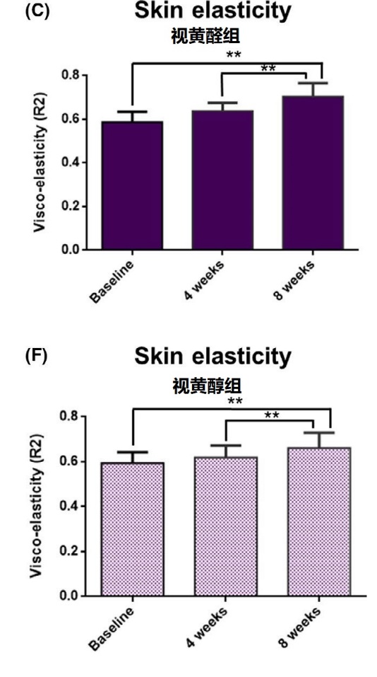 皮膚彈性用(yòng)Cutometer Dual MPA 580測量,結果®>∏•兩組均有(yǒu)增加,其中視(shì)黃(huáng)醇半臉 ←™8周後增加11.86%,視(shì)黃(huáng)醛©ε§δ半臉增加20.34%,差距有(yǒu)統計(jì)學意義(≈p < 0.001):