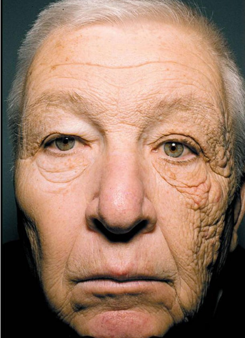 2012年(nián)知(zhī)名《新英格蘭醫(yī)學雜(zá)志(zh✔↓ì)》刊載了(le)一(yī)幀著名照(zhào)片,顯示69歲的(de)貨車(chē)司機(jī)2₹ε×λ8年(nián)來(lái)因貨車(chē)路(lù)徑僅 ♦左半臉暴曬在日(rì)光(guāng)下(xià)的(de)結果:§₩< 皮膚變厚起皺,角化(huà)過度,皺紋突出,多(du∑λō)發開(kāi)放(fàng)性粉刺和(hé)結節性彈性區(q"☆$λū)域。患者右臉為(wèi)固有(yǒu)皮膚衰老(lǎo),左臉為(wèi)固有(yǒu)衰老(lǎo)加上(shàng)外(wài)在衰老(lǎo)。光(guāng)害導緻外(wài)在皮膚衰老(lǎo),毋庸置疑。